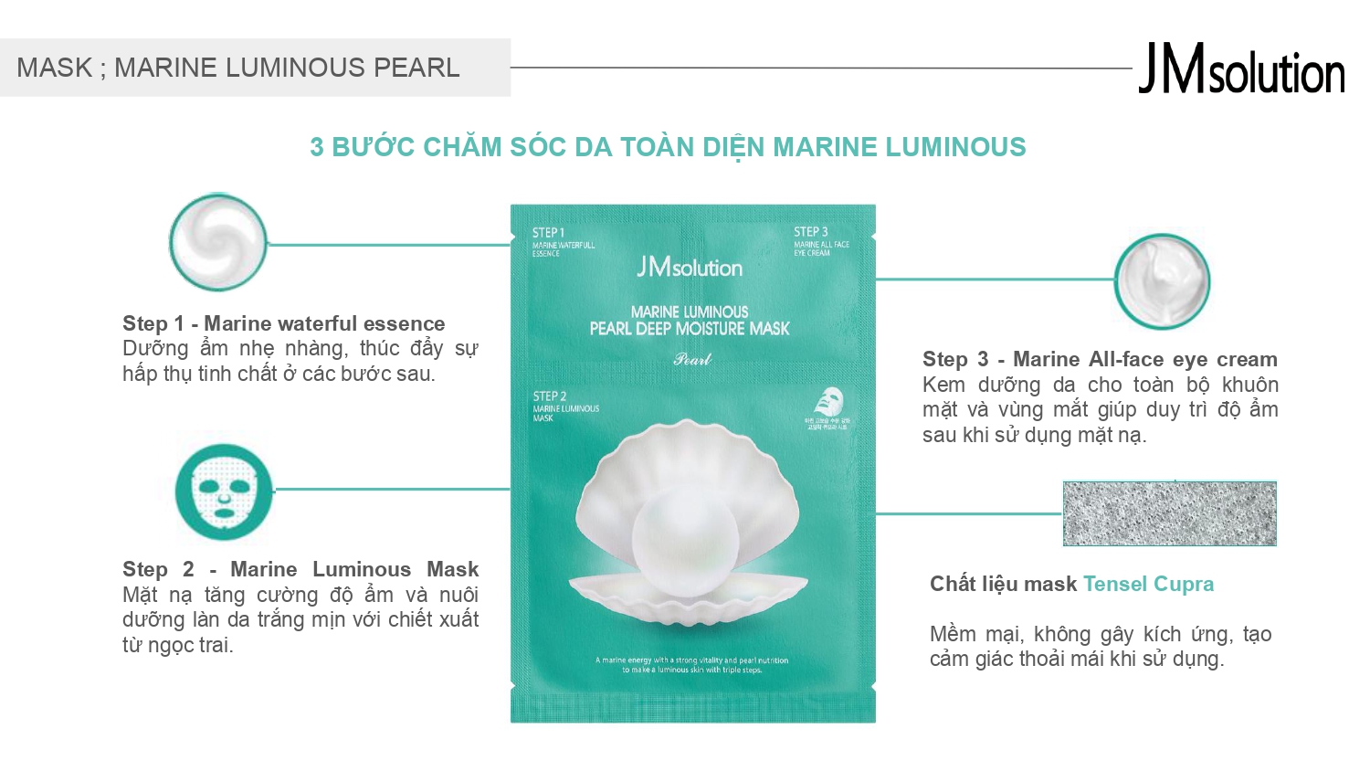 Mặt Nạ JM Solution Mask Chiết Xuất Ngọc Trai 30ml có thành phần chính là nước biển sâu của tỉnh Gangwondo (Hàn Quốc) giúp cấp ẩm, cân bằng độ pH, thanh lọc và truyền sức sống cho làn da. Collagen tự nhiên từ biển cả giàu Acid Amin giúp đẩy lùi dấu hiệu lão hóa, cấp ẩm và nuôi dưỡng làn da hồng hào, săn chắc. Thêm vào đó, 5 loại chiết xuất từ đại dương gồm tảo bẹ, tảo bẹ Undaria, tảo Nia, ngón biển và rong bún thắt giúp tăng cường cấp ẩm, cải thiện độ săn chắc của làn da, củng cố và tăng cường lớp hàng rào bảo vệ da, dưỡng da mịn màng, đàn hồi hơn.