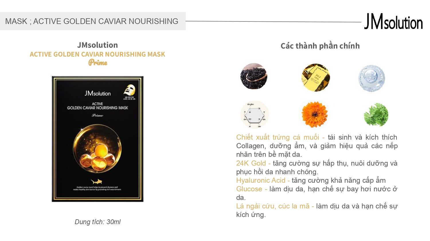 Mặt Nạ Cá Tầm Vàng Dưỡng Ẩm Và Săn Chắc Da JM Solution Active Golden Caviar Nourishing Mask Prime có tác dụng: giúp cung cấp độ ẩm cho da, giúp làm dịu và giảm tình trạng da khô, giúp da trở nên mềm mịn và đàn hồi hơn; giúp tăng cường độ đàn hồi và săn chắc của da; giúp làm sáng da và cải thiện làn da xỉn màu; giúp thúc đẩy tái tạo tế bào da, giúp giảm thiểu nếp nhăn và tình trạng da lão hóa, làm cho da trở nên mịn màng và trẻ trung hơn.