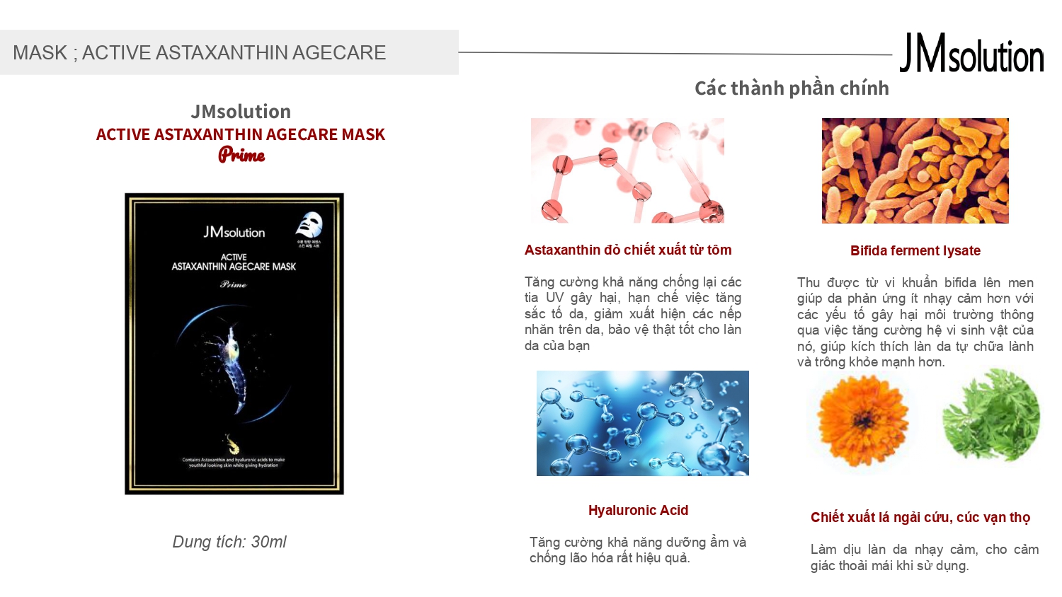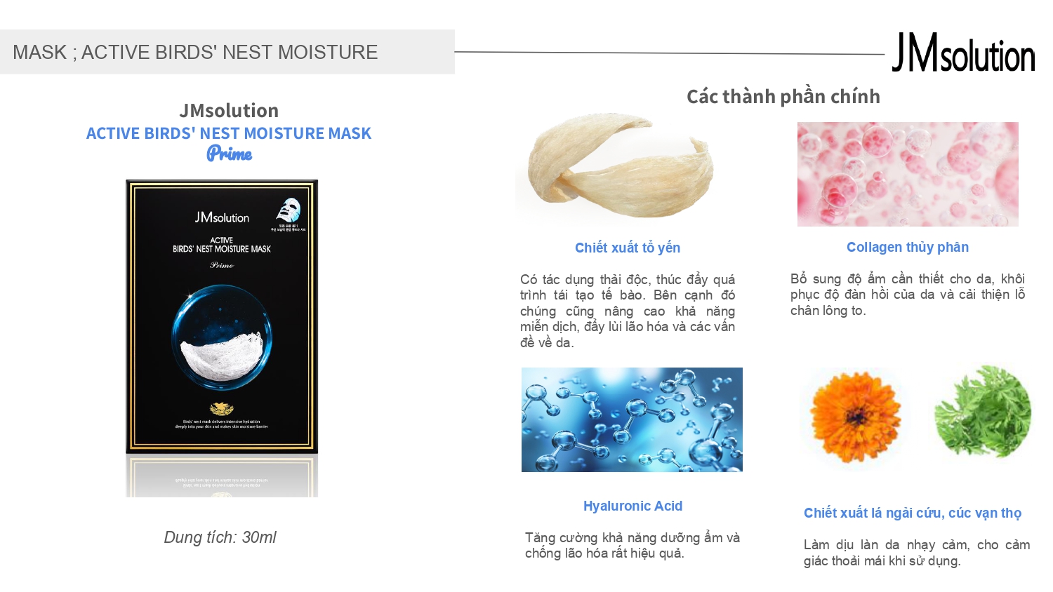 Hiện nay, JM Solution đang cho ra mắt thị trường 12 loại mặt nạ đều chứa 3 loại peptide: Sodium Hyaluronate, Acetyl Hexa-peptide-8, Palmitoyl Tri-peptide-4 cc đầy đủ dưỡng chất giúp cải thiện nếp nhăn, tăng độ đàn hồi và tăng sức đề kháng cho da.